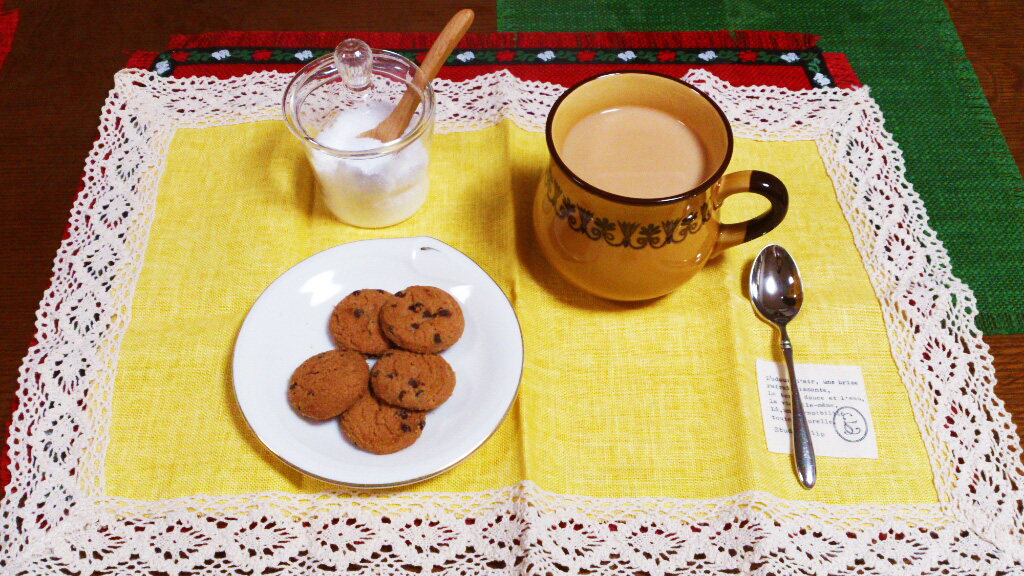 リプトンイエローラベルのティーバッグで淹れたミルクティーと、ミスターイトウのチョコチップクッキーのミニです。