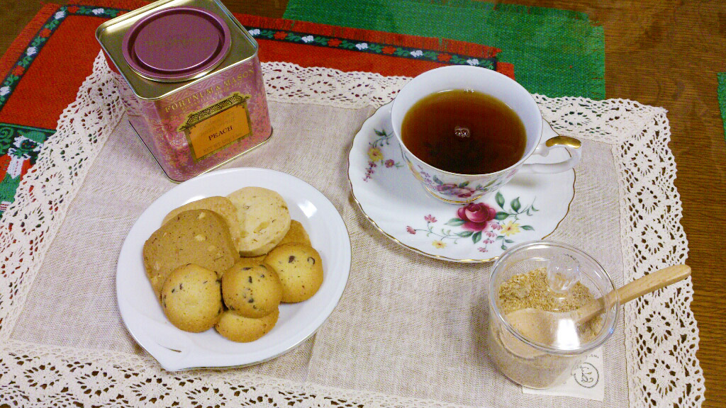 フォートナムアンドメイソンのピーチと、クロードというパティスリーのクッキーです。