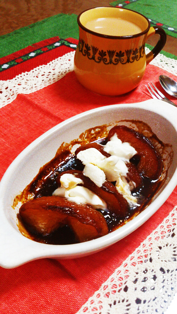 りんごを砂糖とバターで煮詰め、オーブンで焼いた後にバニラアイスをのせました。