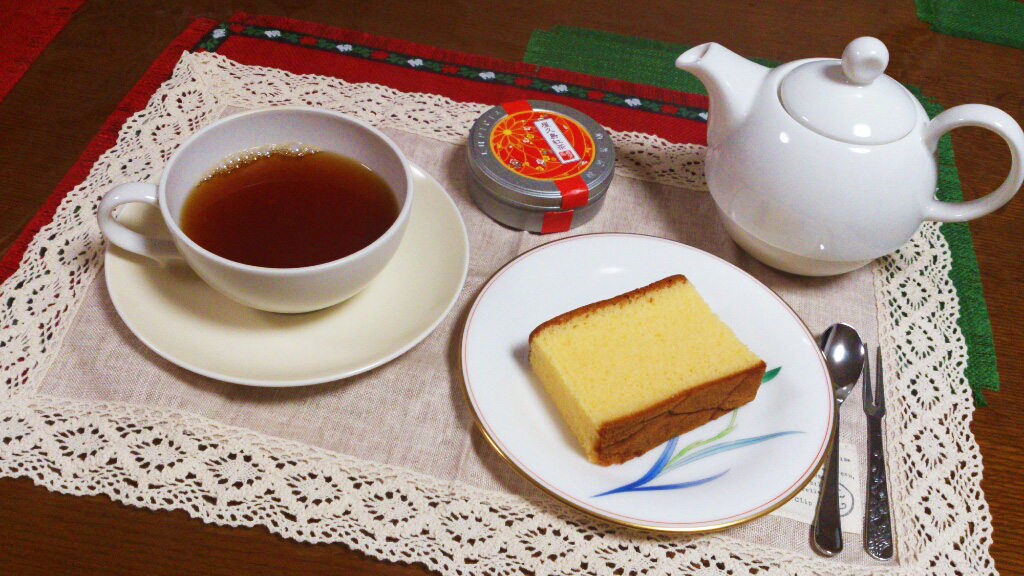 お土産でいただいたカステラに、屋久島紅茶を合わせました。